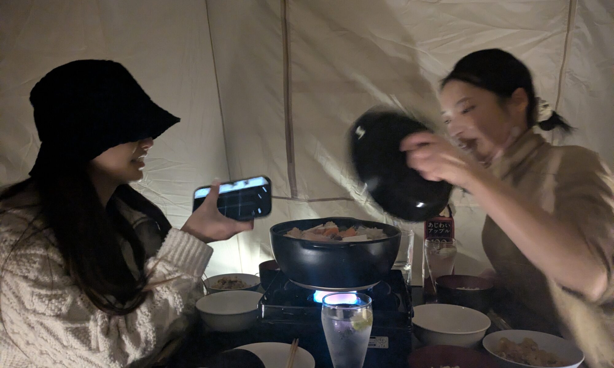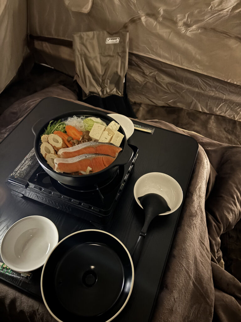 寒空の下、テントの中でぬくぬく鍋を囲む